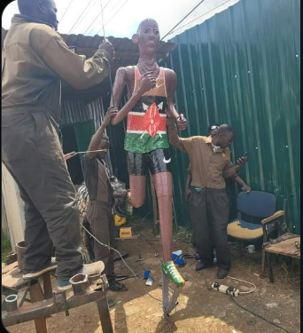 Adorned in a vest with the Kenyan flag, the sculpture features the athlete clutching what appears to be a machete—a far cry from the standard depiction of an Olympic champion. The artistic representation has sparked a wave of humorous reactions online.