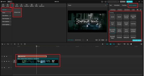 Press the "Text to speech" tool, copy the script, and select one voice style (male/female, cheerful/calm). The AI voice-over would be created automatically with CapCut. You have the option of trying out various voices before settling on the voices that complement your tone best.