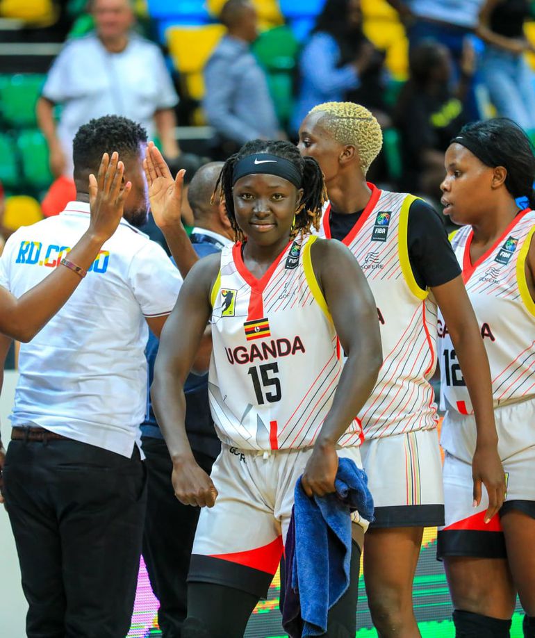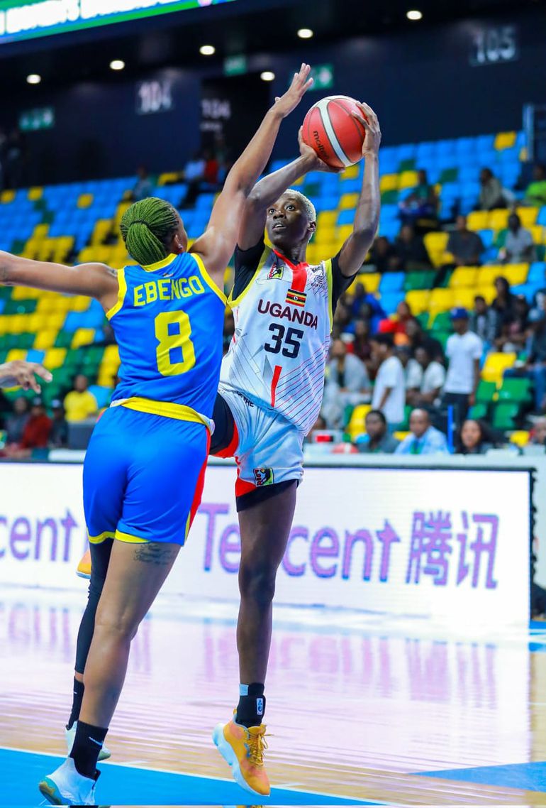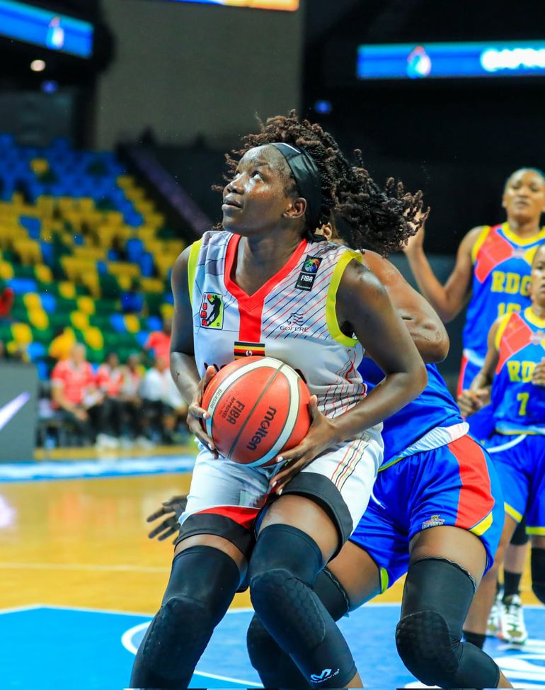 Claire Lamunu( white) continues to prove her doubters wrong with a stunning 12 points, 14 rebounds double double to help send Uganda to the quarter finals| Gazelles photo