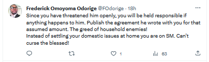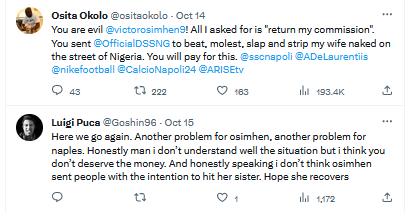 “You are evil @victorosimhen9! All I asked for is "return my commission". You sent @OfficialDSSNG to beat, molest, slap and strip my wife naked on the street of Nigeria. You will pay for this,” Osita tweeted on X.
