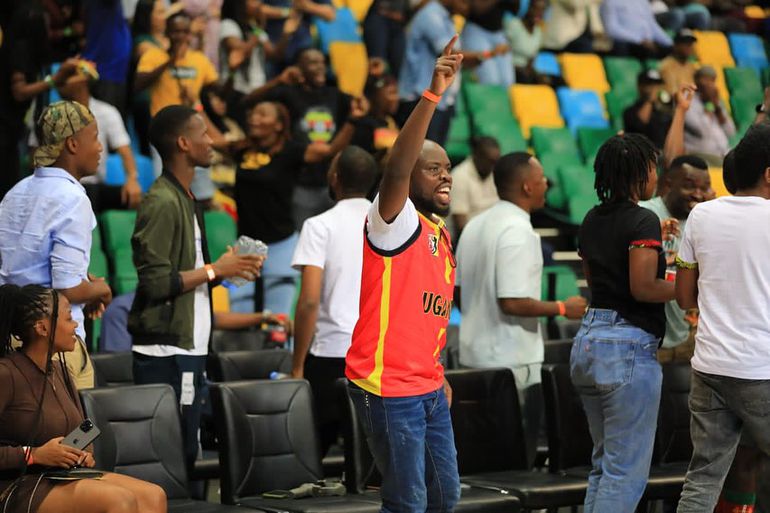 Moses Echodu cheers on the Uganda Gazelles at the 2023 FIBA Afrobasket | photo Credit: Moses Echodu via Twitter