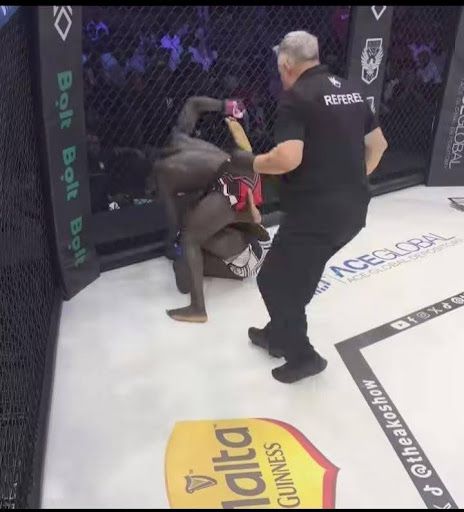 Round 2 opened with a cold shoulder, Mukisi reached out for a glove touch, but Diatta wasn’t in the mood for pleasantries. Instead, he came forward with crisp jabs and leg kicks before unleashing a furious punching flurry that had Mukisi on the defensive. Trying to regain momentum, Mukisi threw another leg kick, but disaster struck, he got injured on his ankle during the process.