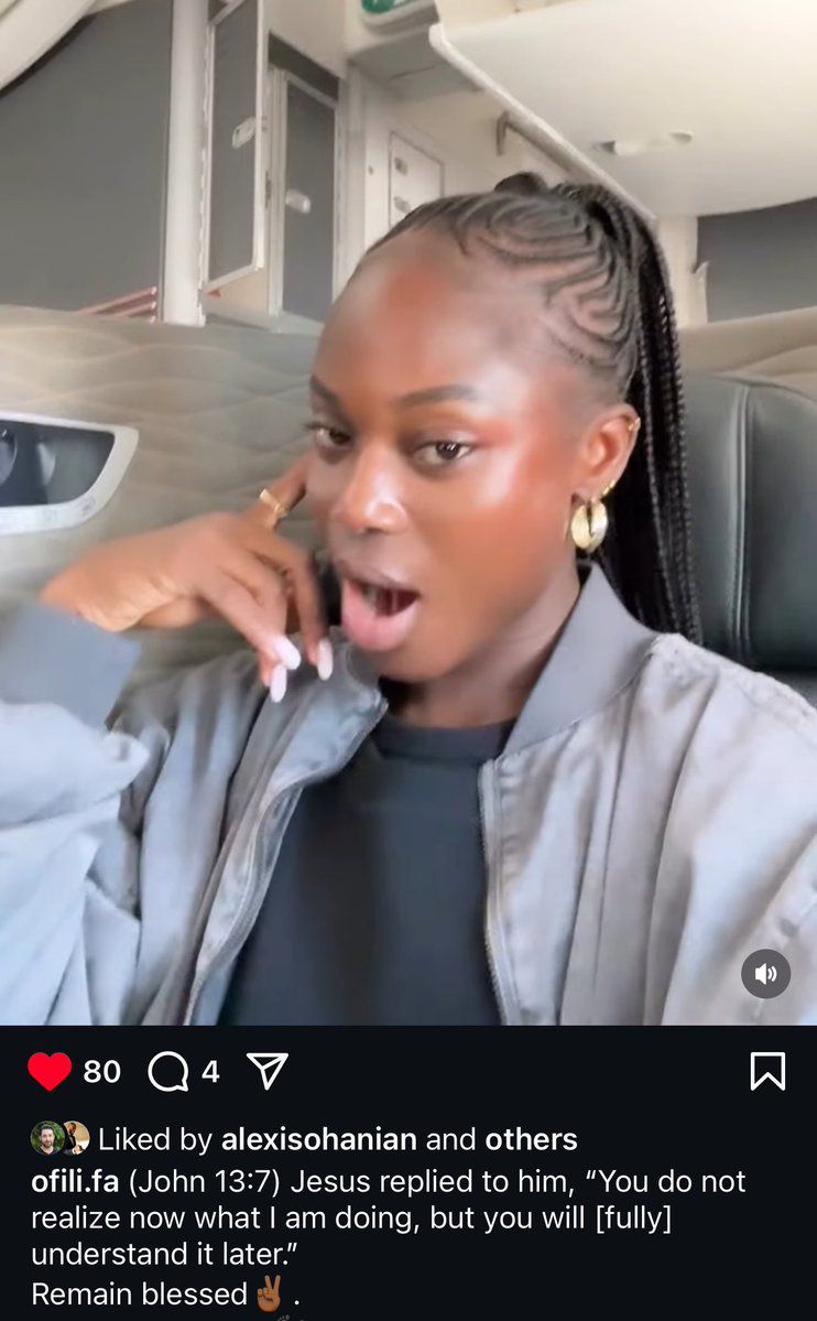 Ofili posted a video on her Instagram page looking all naturally beautiful, flying in business class. She captioned the post with a scripture from the bible: