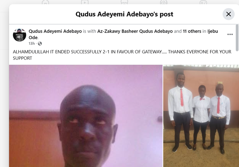 “ALHAMDULILLAH IT ENDED SUCCESSFULLY 2-1 IN FAVOUR OF GATEWAY..... THANKS EVERYONE FOR YOUR SUPPORT.”