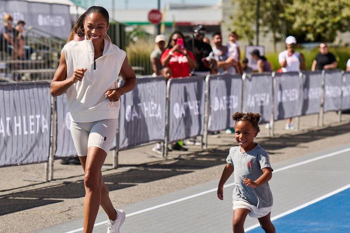 Multiple world and Olympic champion Allyson Felix jogs with her daughter. Photo: Allyson Felix Instagram.