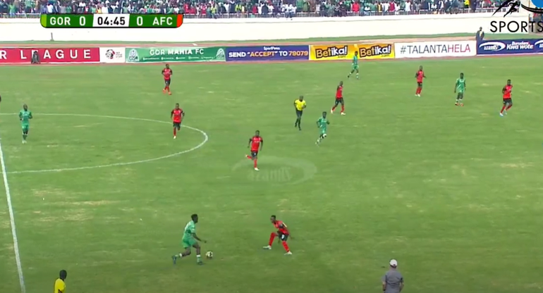 However, Gor Mahia players were intelligent enough to cut the passing lanes in their 4-1-4-1 shape off the ball. The two number eights made sure that the lanes to Clifton Miheso, who was playing as the number 10 for AFC Leopards were few and far between.
