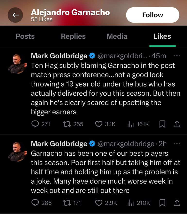 “Ten Hag subtly blaming Garnacho in the post-match press conference...not a good look throwing a 19-year-old under the bus who has actually delivered for you this season. But then again he's clearly scared of upsetting the bigger earners.”