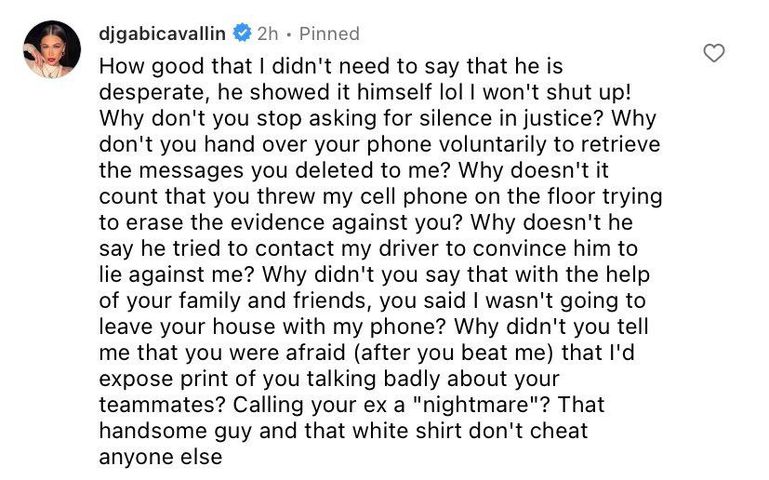 “How good that I didn’t need to say that he is desperate, he showed it himself. Lol I won’t shut up! Why don’t you stop asking for silence in justice? Why don’t you hand over your phone voluntarily to retrieve the messages you deleted to me? Why doesn’t it count that you threw my cell phone on the floor trying to erase the evidence against you? Why doesn’t he say he tried to contact my driver to convince him to lie against me? Why didn’t you say that with the help of your family and friends, you said I wasn’t going to leave your house with my phone? Why didn’t you tell me that you were afraid (after you beat me) that i’d expose a print of you talking badly about your teammates? Calling you ex a ‘nightmare”? That handsome guy and that white shirt don’t cheat anyone else”