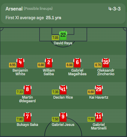Our anticipated formation for the Gunners is a 4-3-3, and the potential starting lineup might look like this: Raya; White, Saliba, Gabriel, Magalhães, Zinchenko Rice, Odegaard, Havertz; Saka, Jesus, Martinelli.