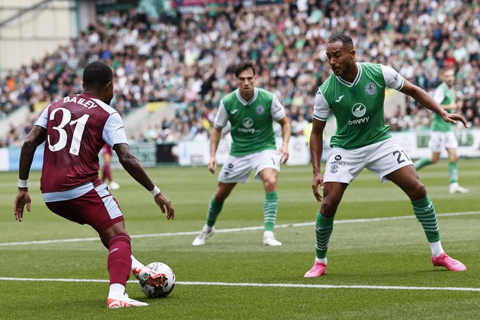 Jordan Obita of Hibernian (right) defends against Leon Bailey of Aston Villa during the UEFA Europa Conference League Play-Off First Leg match at Easter Road.