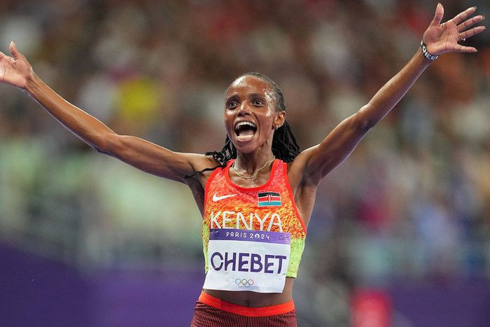 Beatrice Chebet celebrates one after winning gold at Paris 2024 Olympics. Photo: Imago