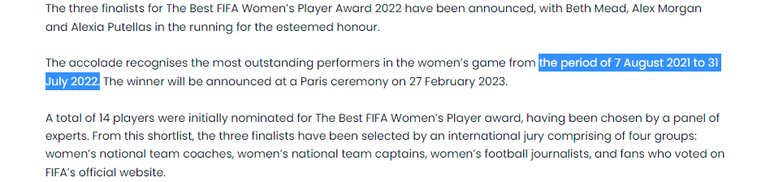 You see, despite the award for the Best FIFA Women’s Player of the Year for 2022 being handed out well after the year 2022 has ended, the period for consideration is not the calendar year, but rather the year according to the football season.