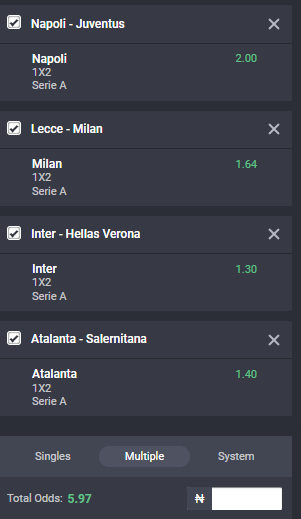 Bet on this 5 odds accumulator for Serie A games