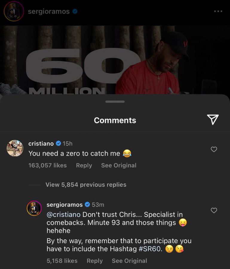 After Sergio Ramos hit 60 million Instagram followers, Cristiano Ronaldo wrote a humorous comment on his former Real Madrid teammate's photo.