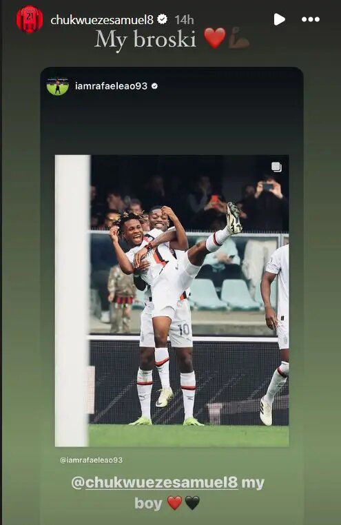 In a show of support and camaraderie, Rafael Leao, Chukwueze's teammate at AC Milan, took to Instagram to congratulate the Nigerian winger on his milestone achievement.
