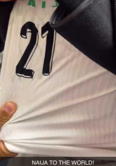 Bassey lifting the jersey with a smile, accompanied by the caption "Naija to the World!"