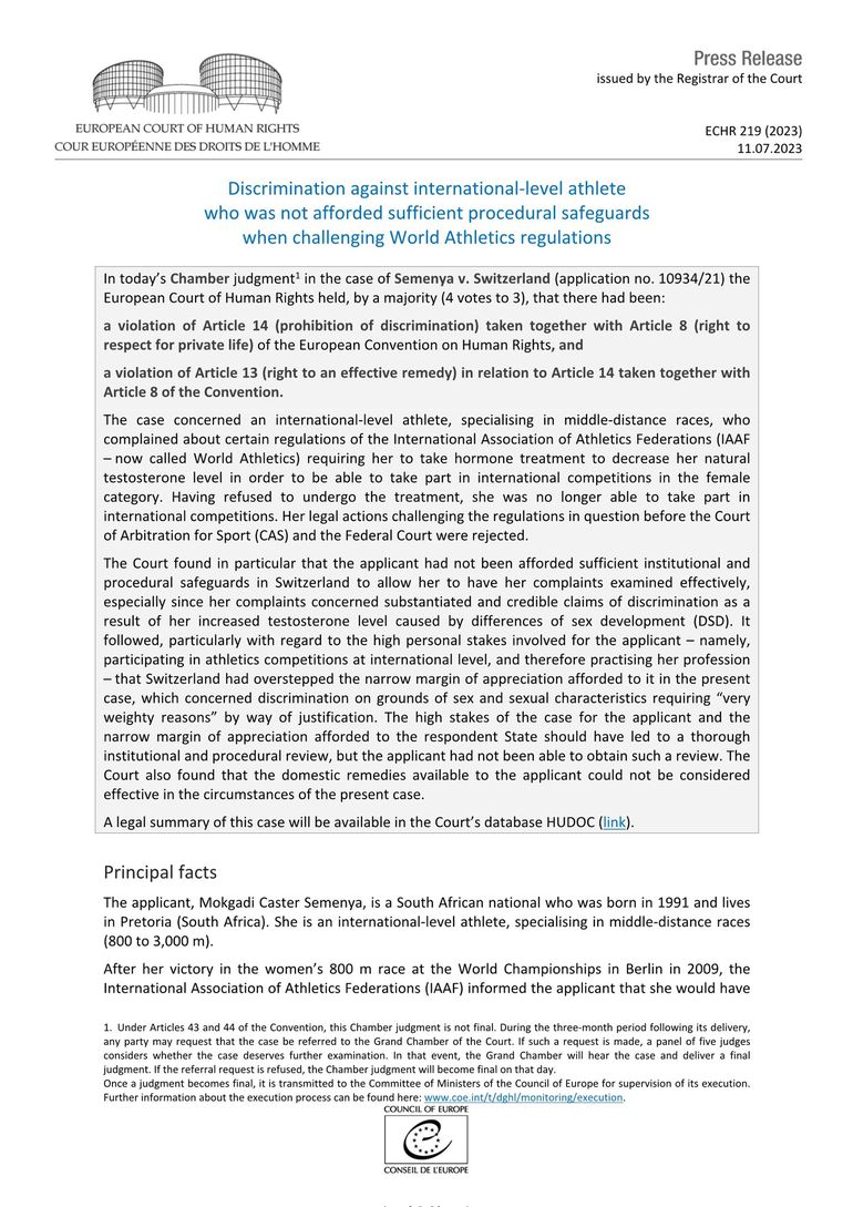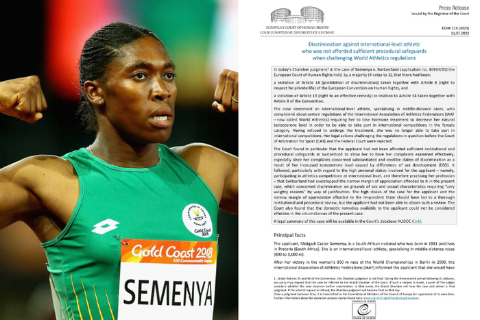 "World Athletics notes the judgment of the deeply divided Chamber of the European Court of Human Rights (ECHR). We remain of the view that the DSD regulations are a necessary, reasonable, and proportionate means of protecting fair competition in the female category as the Court of Arbitration for Sport and Swiss Federal Tribunal both found, after a detailed and expert assessment of the evidence," read the release.