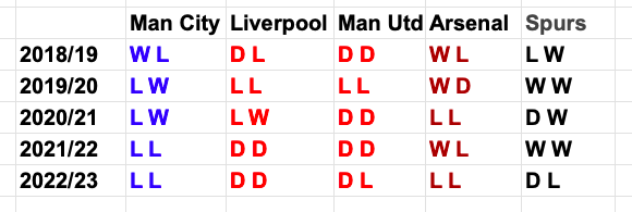 This contrasts the broad success they enjoyed against these same clubs in the five years leading up to 2018-19, where Chelsea enjoyed more victories over the other members of the Big Six except City, with whom they tied four wins apiece.