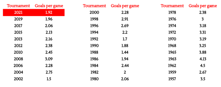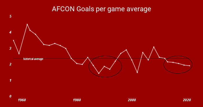 The 2021 AFCON was, on average, the lowest-scoring tournament in 20 years, with 1.92 goals scored per match. It is also the fifth-lowest scoring in history: only the 1988, 1990, 1992 and 2002 editions witnessed fewer on average.