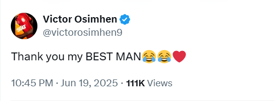 Osimhen, currently on loan with Galatasaray, responded promptly with a witty reply, calling Boniface his “BEST MAN” and adding laughing emojis to emphasise the joke.