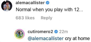 Romero went on social media to hail his teammates' effort during the win and Mac Allister made a comment under the post which led to a hit back from the Tottenham defender.
