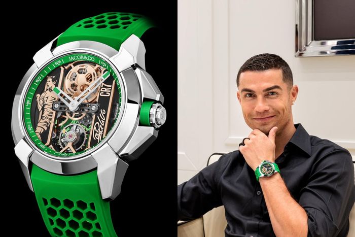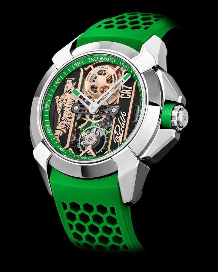 The green watch is studded with 26 white diamonds and features his trademark 'Siuuu' celebration.