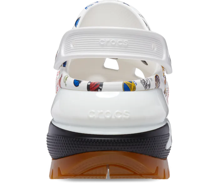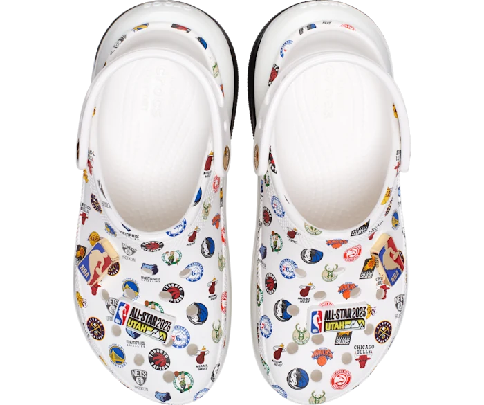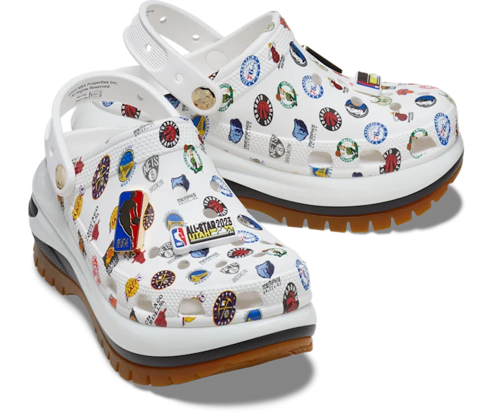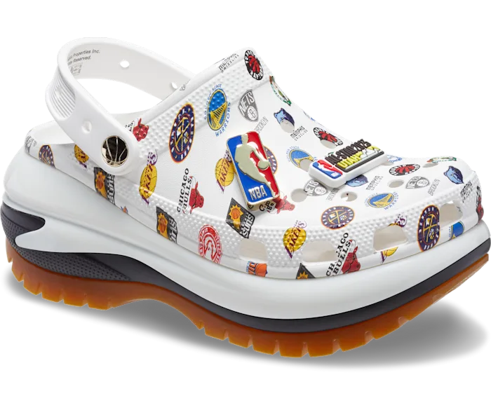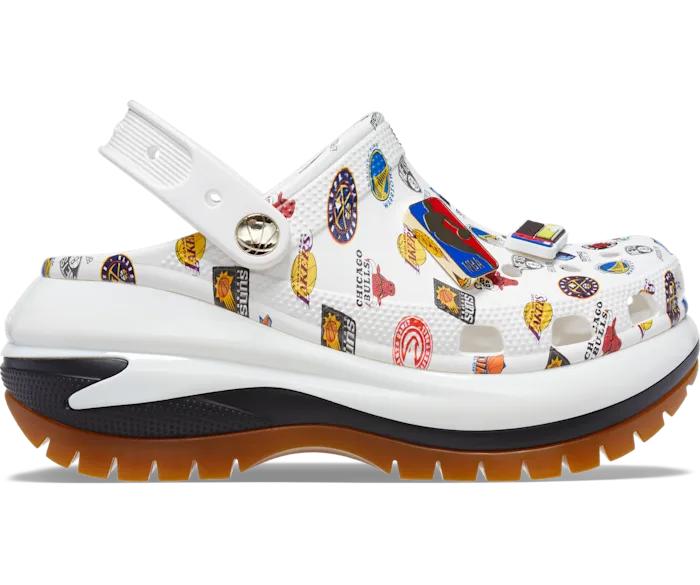 The NBA All Star Mega Crush Clog features an enhanced rubber tread, updated detailing around the outsole, a platform ready to take any outfit to the next level, and an all-over select NBA team logo print to show love for your team.