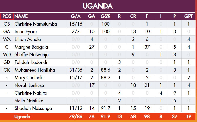 Familiar faces completed the onslaught, with Shadia Nassanga netting 12/13 (92.3%), Mary Nuba scored 17/19 (89.5%), and Irene Eyaru scored 7/7.
