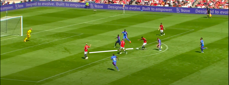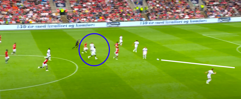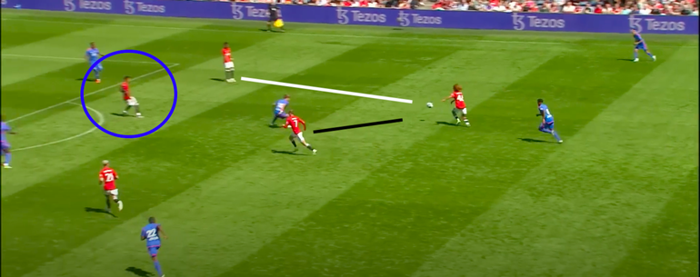 The England midfielder wastes no time releasing Amad Diallo, isolating the wide attacker with the Leeds defender.