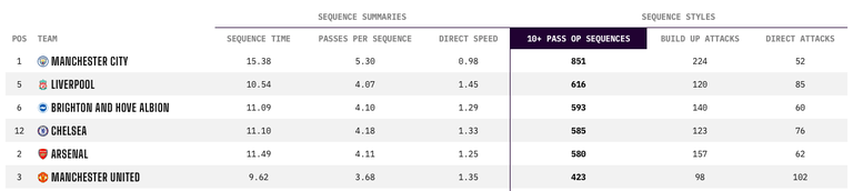 This placed United sixth among the 20 Premier League sides, but the chasm between the Red Devils and fifth-placed Arsenal (580 sequences comprising 10 passes or higher) was striking. Expectedly, Manchester City and Liverpool ranked first and second, with 851 and 616, respectively.
