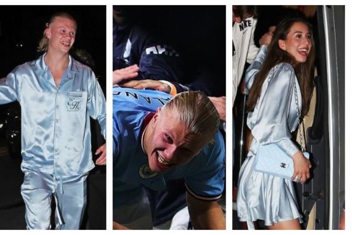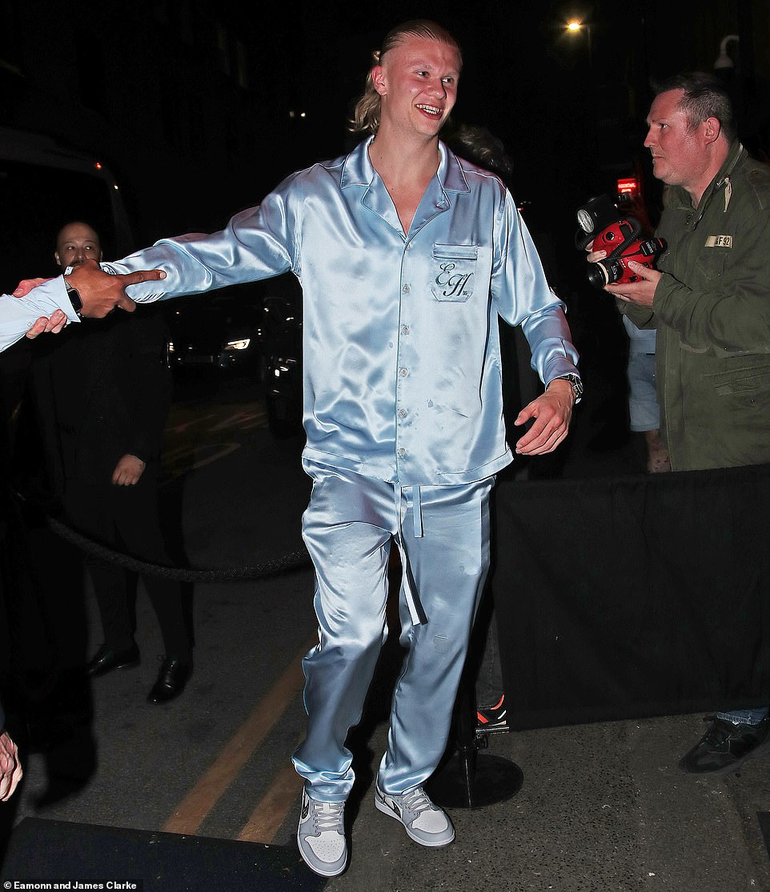 Haaland and his girlfriend turned up in matching sky blue pyjamas, with his teammate Phil Foden and his girlfriend also stepping out in something close.