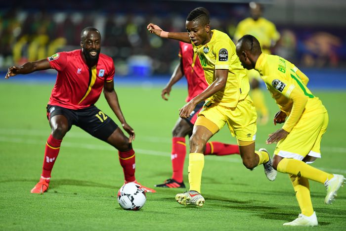 Obviuos Karuru (2nd R) of Zimbabwe competes with Ronald Brian Ddungu Mukiibi (L) of Uganda during the 2019 Africa Cup of Nations