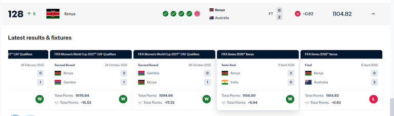 Beldine Odemba’s team gained 9.94 points from their win over India and 0.82 from the loss to Australia, which takes their tally to 1,104.82 points.