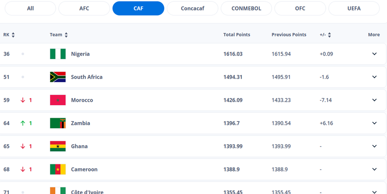 FIFA Rankings: Nigeria ahead of Ghana& South Africa, remain best team on the continent