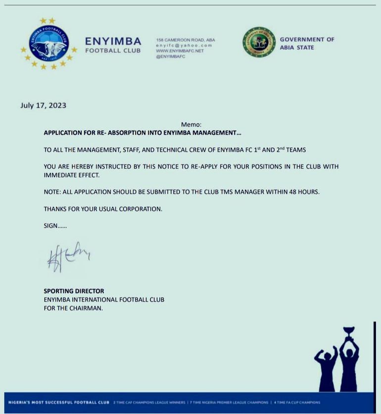 “The management, staff and technical crew of Enyimba first and second teams are hereby instructed to re-apply for their positions with immediate effect,” the letter stated.