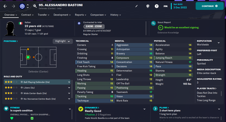 Bastoni’s immense potential at age 23 makes him easily one of the best central defenders in Football Manager 2023.