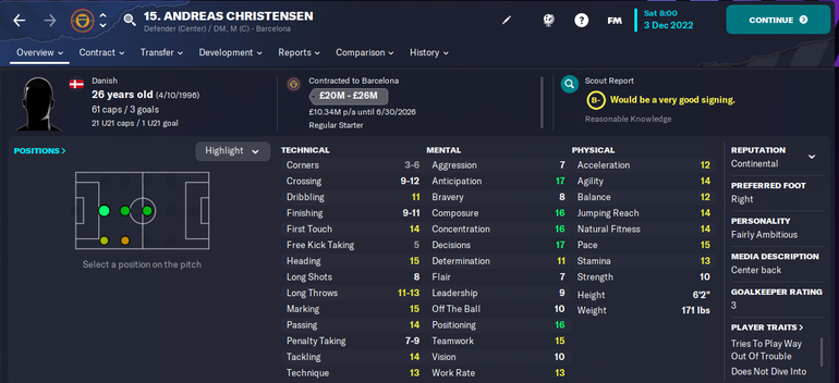 The 25-year-old Denmark international is currently under contract with Catalan giants Barcelona and is one of the best central defenders in Football Manager 2023.