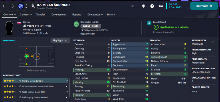 Skriniar is one of the best central defenders in Football Manager 2023. Although, Skriniar's agreement to join PSG is now part of FM following the winter update, he's still on an expiring contract with Inter.