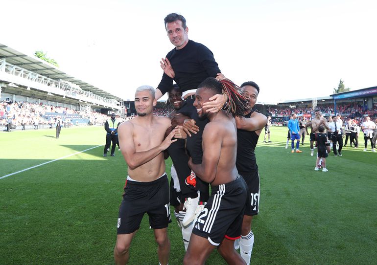 Marco Silva lifted by Fulham's Andreas Pereira and Alex Iwobi | Imago