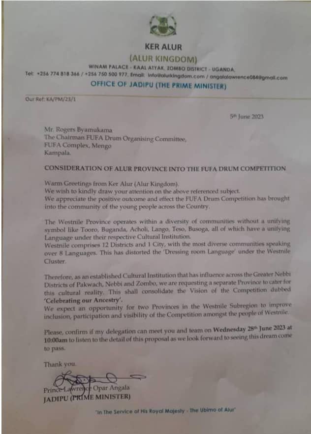 In a letter dated June 5 and addressed to Rogers Byamukama, the FUFA Drum Organizing Committee Chairman, Lawrence Opar Angala, the Prime Minister of Alur Kingdom, extended an invitation for a meeting on June 26 to discuss their concerns.