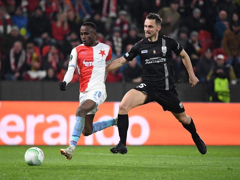 From left Yira Sor of Slavia Prague and James Holland of LASK Linz in action during the opening match of football European Conference League Slavia Praha vs LASK Linz in Prague, Czech Republic, March 10, 2022.
