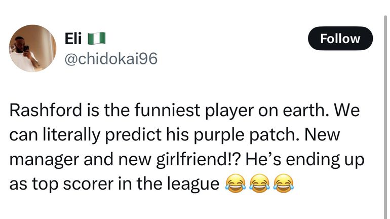 One fan humorously wrote, “Rashford is the funniest player on earth. We can literally predict his purple patch. New manager and new girlfriend!? He’s ending up as top scorer in the league.”