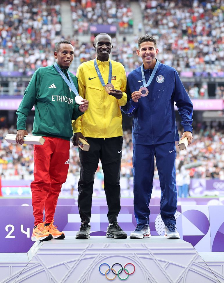 Joshua Cheptegei (C) at the 10,000m victory ceremony at the Paris 2024 Olympics (Credit: Imago)