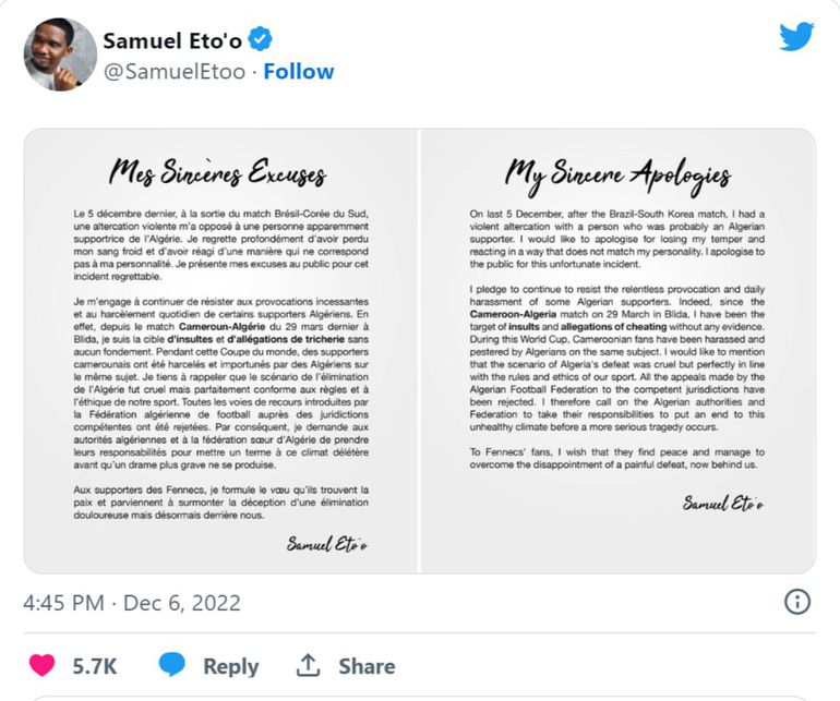 "During this World Cup, Cameroonian fans have been harassed and pestered by Algerians on the same subject. I would like to mention that the scenario of Algeria's defeat was cruel, but perfectly in line with the rules and ethics of our sport."