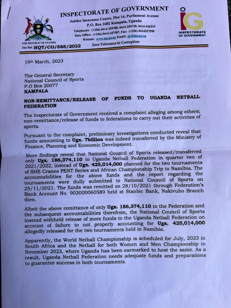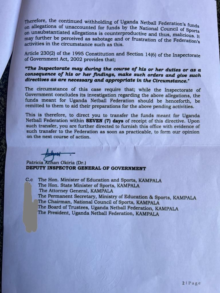 "This is to direct you (NCS) to transfer the funds meant for Uganda Netball Federation within seven (7 days) of receipt of this directive upon the transfer," the letter from the Deputy IGG, Patricia Achan Okiria, directed.