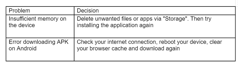 Sometimes problems arise when installing the application, but most of them are easily solved. The table lists common errors and how to fix them: