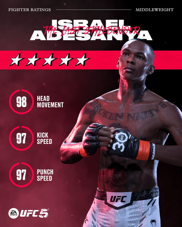 EA has also released a list of the highest-rated fighters in the game with some serious heavy hitters making the top spot like Nigerian-born Kiwi fighter Israel Adesanya, who is also the cover star of UFC 5 deluxe edition.