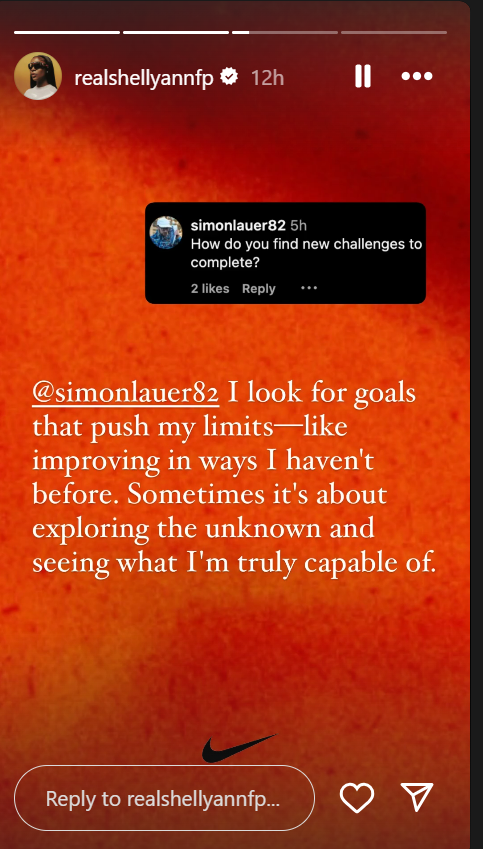 Reflecting on how she keeps moving forward despite challenges, Fraser-Pryce responded to a fan on Instagram with a heartfelt perspective.