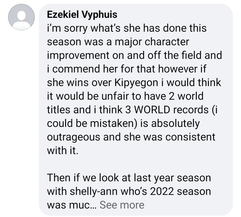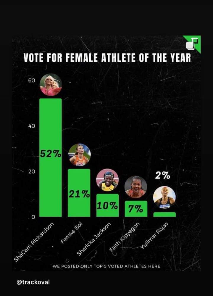 However, in a recent poll conducted, the American track star topped by a high 52%, Dutch 400m Hurdles world champion Femke Bol was second with 21% votes, Jackson third at 10%, and Kipyegon a distant fourth with just 7% votes.