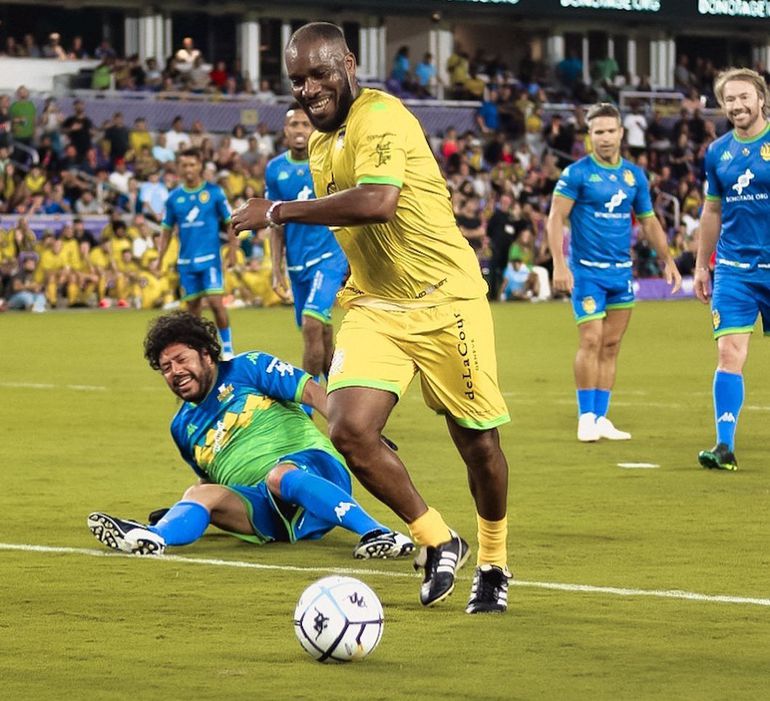 Jay-Jay Okocha dribbles the goalkeeper during a charity game